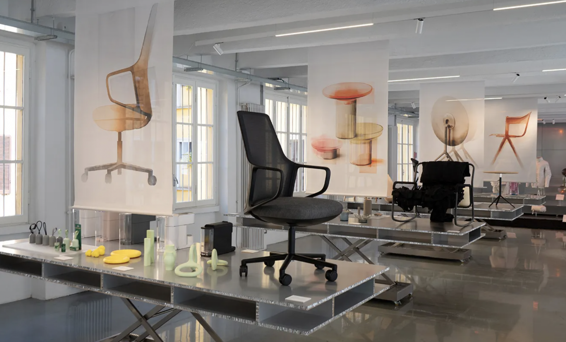쇼룸에서는 필립 스탁(Philippe Starck), 파트리시아 우르키올라(Patricia Urquiola), 벤자민 휴버트(Benjamin Hubert), 알프레도 해버리(Alfredo Häberli), 애프터룸(Afteroom) 등의 디자이너와 협업한 새로운 컬렉션이 공개되었습니다. 특히, 필립 스탁은 지속 가능한 합판을 활용한 'Forest Club' 라운지 시리즈를 통해 자연과의 조화를 강조하였으며, 벤자민 휴버트는 모듈형 가구 시스템 'Calma Lounge'를 선보였습니다.