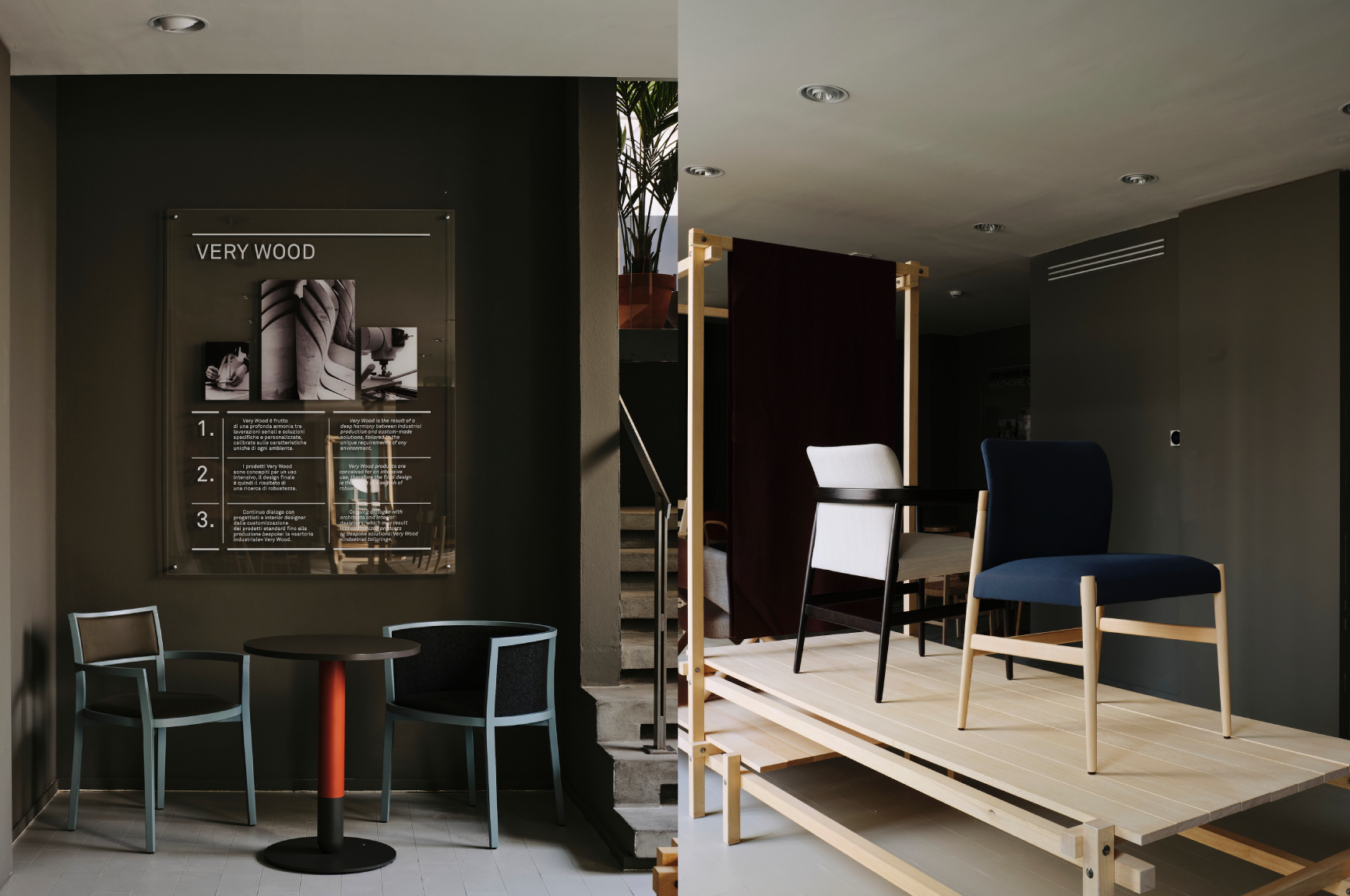 베리우드(Very Wood)는 밀라노 중심부 비아 스파르타코(Via Spartaco) 34번지에 위치한 쇼룸에서 전시를 선보였습니다. 이 공간은 제르바소니(Gervasoni)와 공유하는 산업 스타일 공간으로, 브랜드의 대표 컬렉션을 전시하며 자연 소재, 정제된 장인정신, 환대의 미학을 강조하였습니다 . 전시에는 크리스토프 필레(Christophe Pillet)의 'KHA' 시리즈, 네리&후(Neri&Hu)의 'Weekend' 시리즈, 파트리시아 우르키올라(Patricia Urquiola)의 'Zant' 및 'Crayon' 테이블, 로돌포 도르도니(Rodolfo Dordoni)의 'Egadi' 컬렉션, 필립 니그로(Philippe Nigro)의 'Eclipse' 시리즈, 세바스티안 헤르크너(Sebastian Herkner)의 'Unam' 시리즈 등이 포함되었습니다.