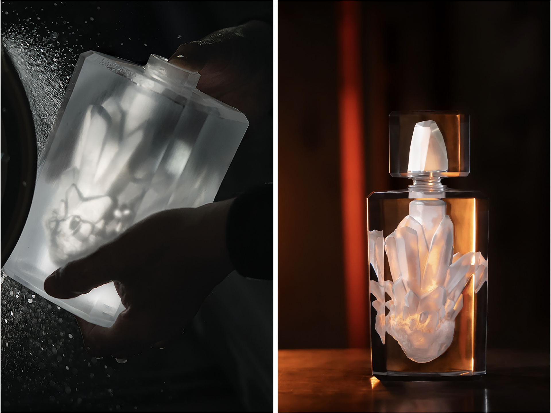 브리오니(Brioni)와 라리끄(Lalique)는 이번 살로네 델 모빌레에서 두알릿 크리스탈 에디션 퍼퓸 Dualité, Crystal Edition Perfume이라는 협업 향수를 선보였습니다. 이 향수는 조각처럼 정교하게 깎인 유리 병 속에 담긴 오브제이자, 마스터 조향사 미셸 알마이락(Michel Almairac)이 조향한 현대적이고 고급스러운 향으로, 앰버의 따뜻함, 그린애플의 상큼함, 바이올렛과 아이리스 버터의 파우더리한 꽃 향이 조화를 이루며 ‘땅과 공기의 이중성’을 표현하고 있습니다. 밀라노 현장에서는 알라바스터 케이스에 담긴 한정판 18병이 공개되었으며, 각 병에는 고유한 서명이 새겨져있습니다.