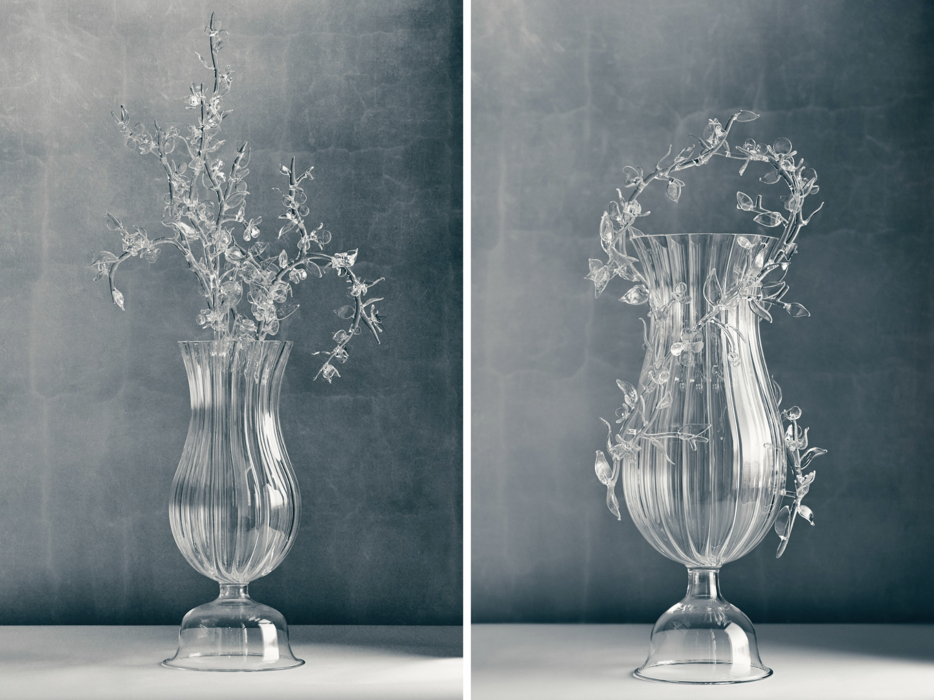 디올(Dior)은 디자이너 샘 바론(Sam Baron)과 협업하여 대형 유리 화병 컬렉션을 선보였습니다. 이는 디올 메종의 '자연에 대한 찬가(Ode à la nature)' 컬렉션의 연장선에 있는 시리즈로, 이탈리아 전통 입으로 불어 만드는 글라스 기법을 사용하여 하나하나 수작업으로 완성되었습니다. 약 1미터에 달하는 높이의 이 화병들은 총 8점 한정 제작되었으며, 나뭇가지, 꽃, 잎 등 자연의 형태에서 영감을 받아 디자인되었고, 동시에 오리지널 미스 디올(Miss Dior) 향수병의 실루엣을 연상시키는 조형미도 갖추고 있습니다.